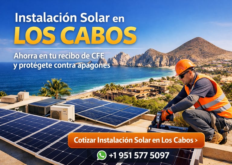 Instalación solar Los Cabos con sistemas diseñados para clima extremo. Reduce CFE y protege tu propiedad. Cotiza hoy.