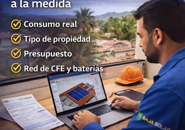 Una vez que el cliente decide dar el paso hacia la energía solar, en Baja Solar diseñamos un sistema solar personalizado que se ajusta a su consumo real, tipo de propiedad y presupuesto.