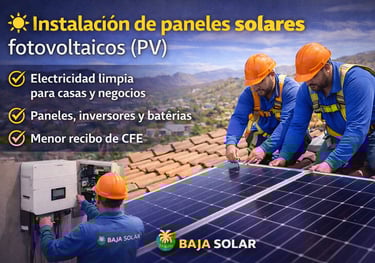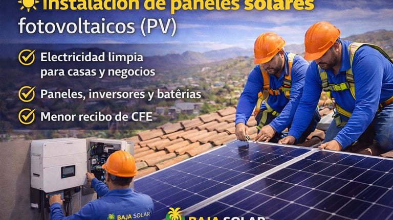 La instalación de paneles solares fotovoltaicos (PV) consiste en convertir la energía del sol en electricidad utilizable para alimentar casas, negocios y propiedades en Baja California Sur.