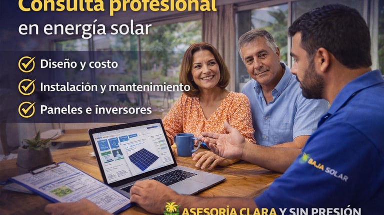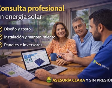 La consulta profesional de Baja Solar te brinda asesoramiento claro y honesto sobre todo el proceso de energía solar, desde el diseño y el costo hasta la instalación, operación y mantenimiento del sistema.