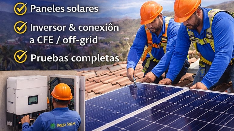 Baja Solar ofrece diseño, instalación y soporte de sistemas de energía solar en Baja California Sur, incluyendo paneles solares, sistemas híbridos con baterías y soluciones off-grid para casas, negocios, ranchos y hoteles, con enfoque principal en Los Cabos.