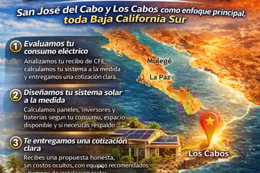 Con esa información preparamos un diseño claro y una cotización honesta para tu sistema solar en Los Cabos o Baja California Sur.