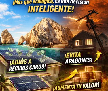 Un sistema solar bien diseñado te permite reducir o eliminar tu recibo de CFE, proteger tu propiedad contra cortes de luz y aumentar el valor de tu hogar o negocio en Los Cabos.